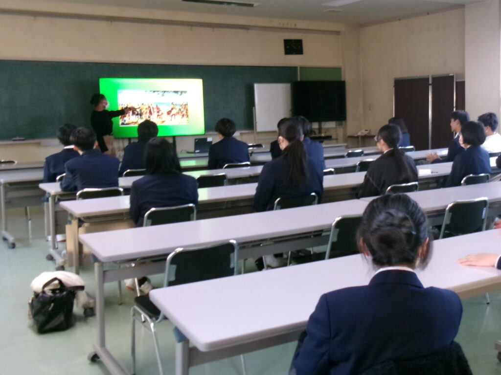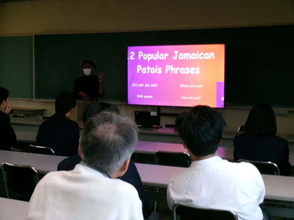 教養講座を行いましたインフォメーション, 委員会活動 / 2025年11月14日 11/14(金)の放課後に教養講座を開催しました。本校ALTのアザ先生から「日本とジャマイカの違い」をテーマにお話していただきました。講座には多くの生徒が集まり、ジャマイカの歴史や言葉について興味深く耳を傾けていました。