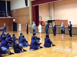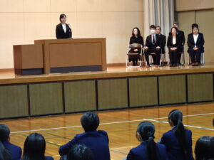 新任式・始業式が行われましたインフォメーション, 学校行事 / 2026年4月8日 4月8日、新任式を行いました。式では、昨年度発表された人事異動により、新たに9名の教職員を迎え、代表者の挨拶がありました。その後、引き続き新体制となった福岡高校で、始業式が行われました。生徒たちは校長先生による英語の式辞を聞き、自身の今年度の目標に考えを巡らせていました。始業式の後には、これから1年間の学校生活を支える教職員の紹介も行われました。